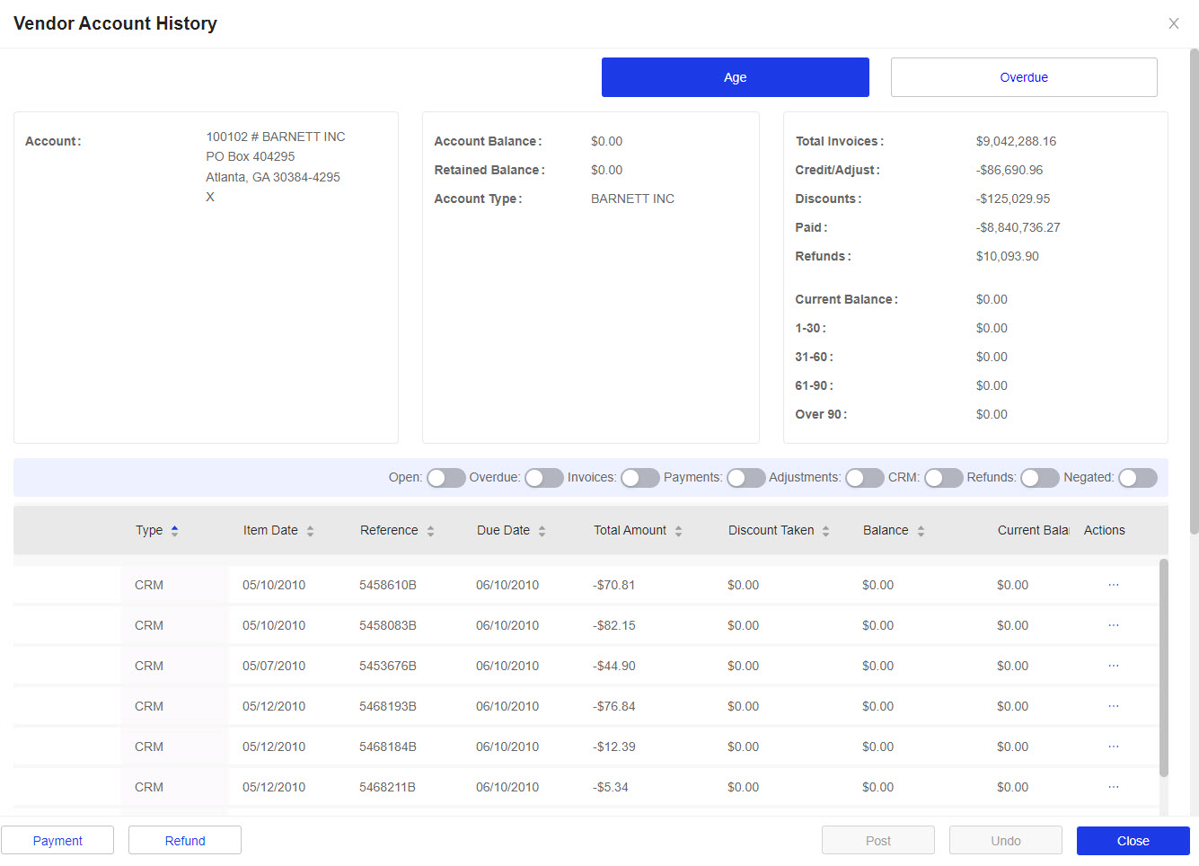 When you have returned parts to a vendor, or if you have received a Credit Invoice from a vendor, you can build a negative AP Invoice to represent the credit in the Vendor's Account History. The credit will appear in the vendor’s account history as a separate item with a transaction type of CRM. Once the credit invoice is recorded on the vendor's account, you will then be able to: