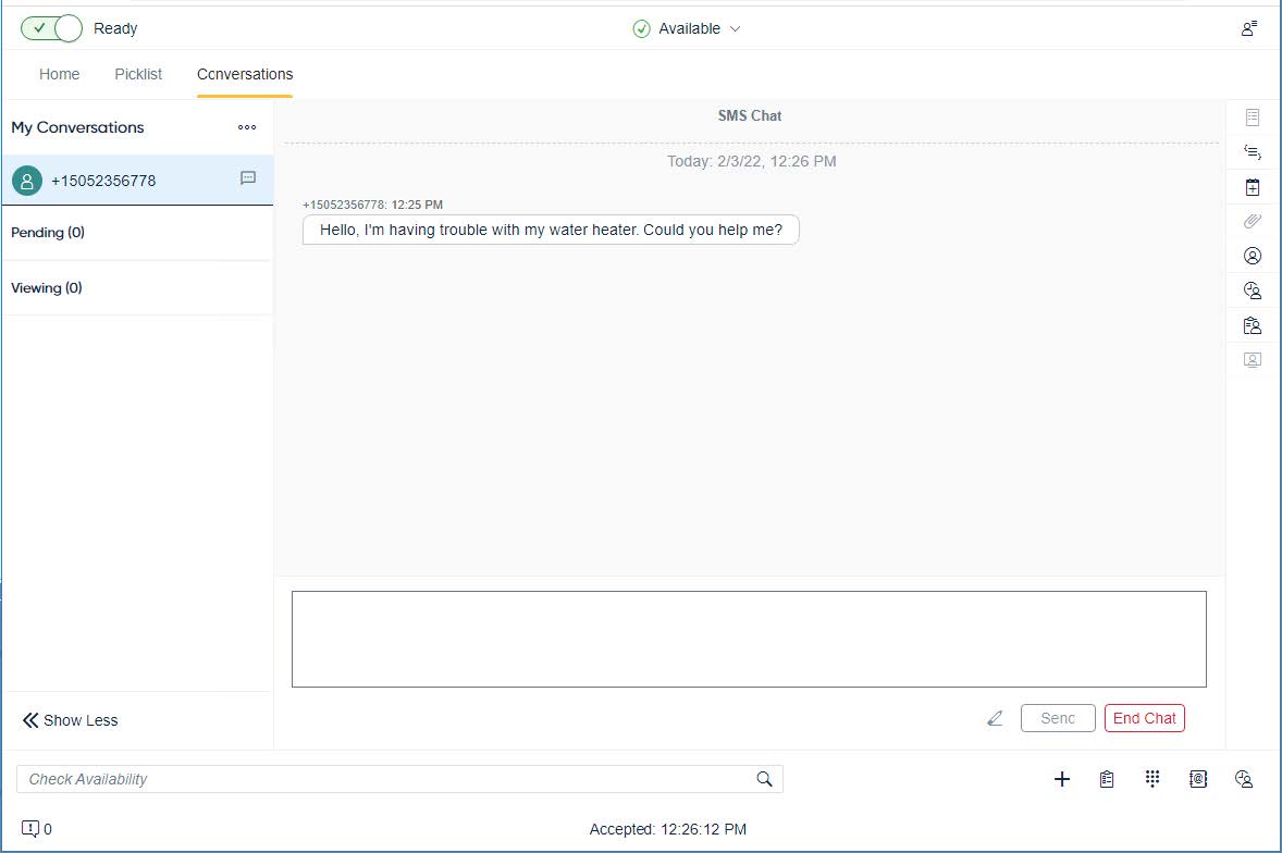 Texts will be directed to anyone who joins the text queue. Once a text is in your queue, it will appear in the Conversations subtab. Customers can use SMS text messages to start a conversation. If a text conversation is assigned to you, it can be Accepted or Declined.